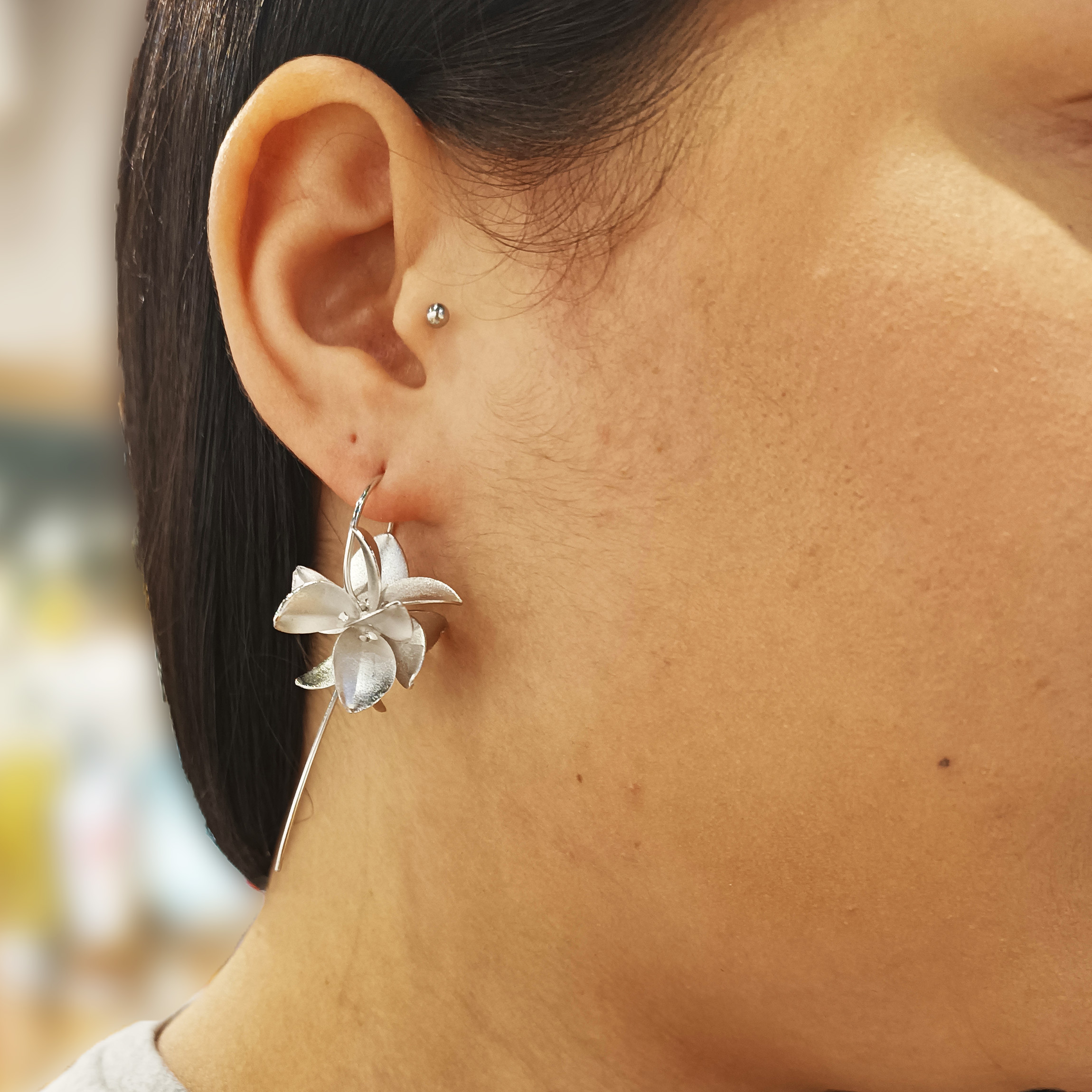O design habilmente esculpido deste brinco captura a essência das pétalas da flor Plumeria, criando uma representação autêntica e detalhada. Cada pétala é meticulosamente moldada para realçar a sua graça única. O acabamento em ródio confere um brilho prateado luxuoso, aumentando a beleza das pétalas da flor.
